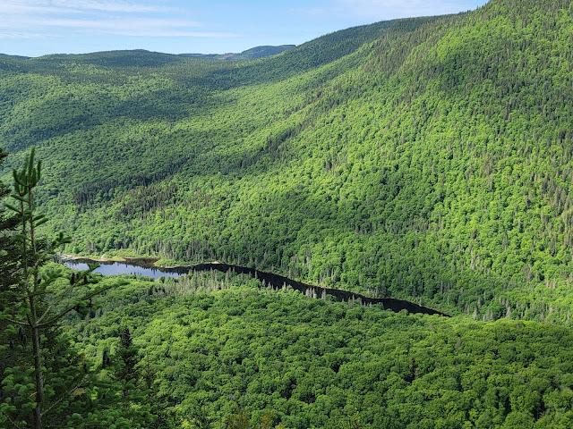 Le sentier est en forêt et rejoint un premier belvédère après 2.7 km. C’est le plus beau point de vue à mon avis, le panorama sur la rivière Jacques-Cartier entre les montagnes est saisissant.