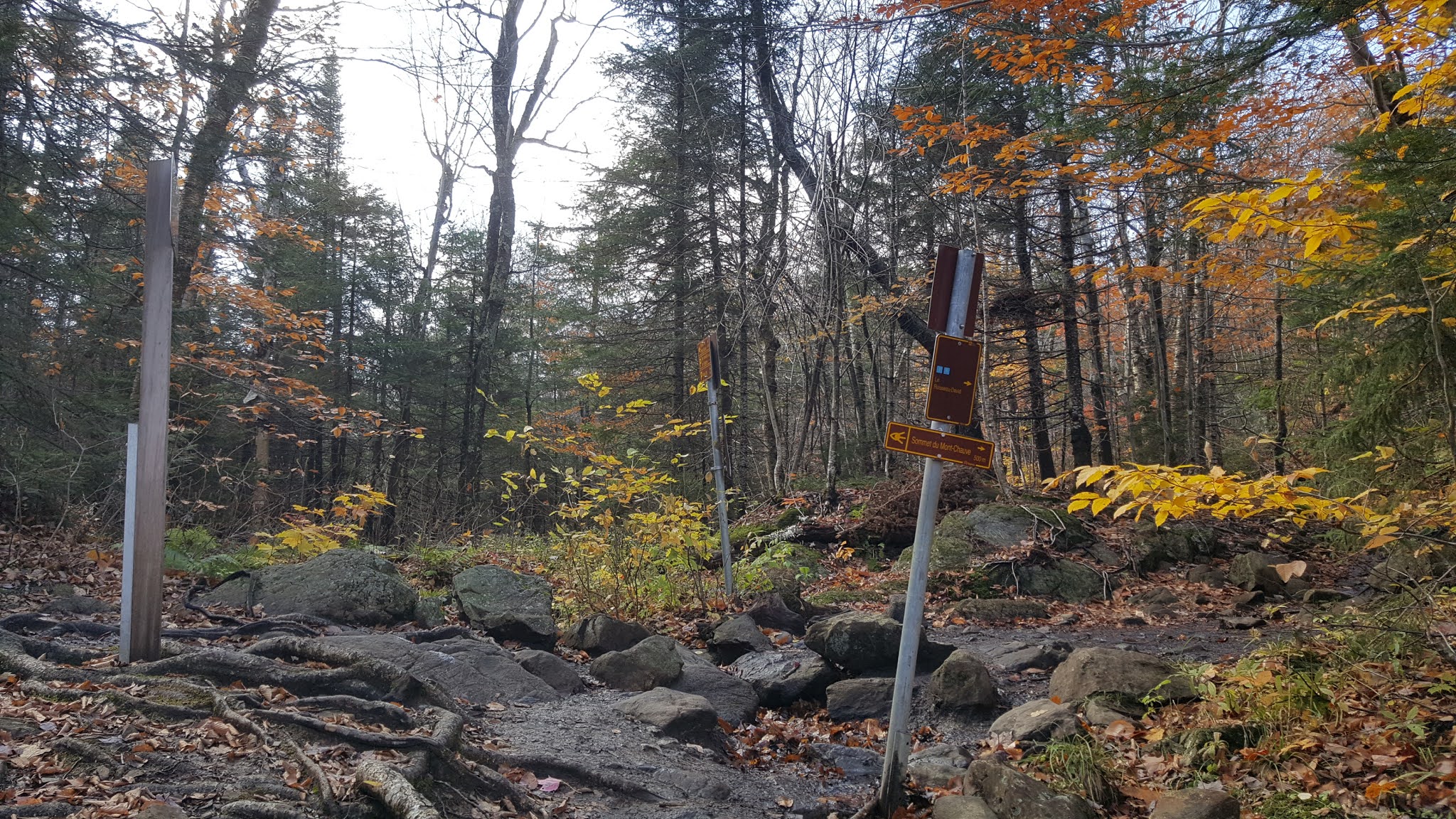 Vous rejoindrez l’intersection pour débuter la boucle du mont Chauve. Ici, vous avez la possibilité de prendre à droite et de vous rendre directement au sommet du mont Chauve qui est situé à 500m de là. C’est le sentier le plus court pour rejoindre le sommet.