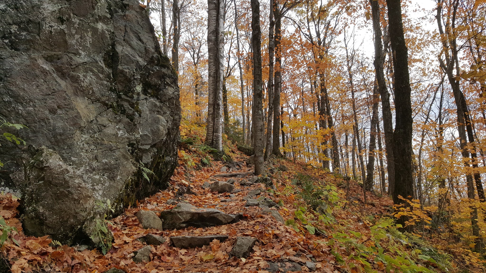 Il y a plusieurs sentiers permettant d’effectuer la boucle du mont Chauve (voir la section des alternatives). Celle décrite ci-dessous est via le Ruisseau David (et ne faites pas comme moi, je croyais longer le ruisseau David durant ma randonnée mais aucun ruisseau… on ne le voit que sur la route près du stationnement ?).