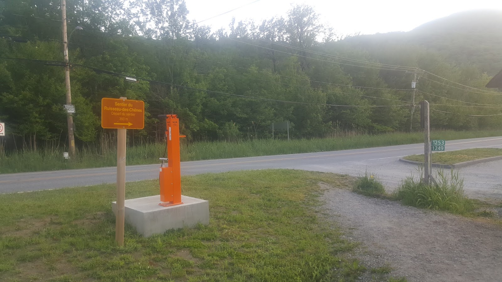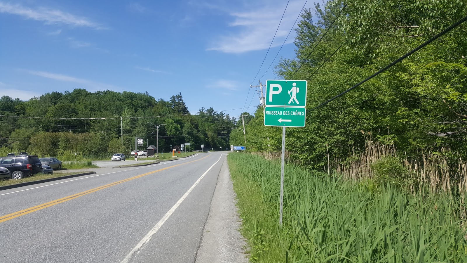 Il faut marcher 350 m sur l’accotement de la route 112 pour rejoindre le point de départ du sentier du Ruisseau des Chênes.