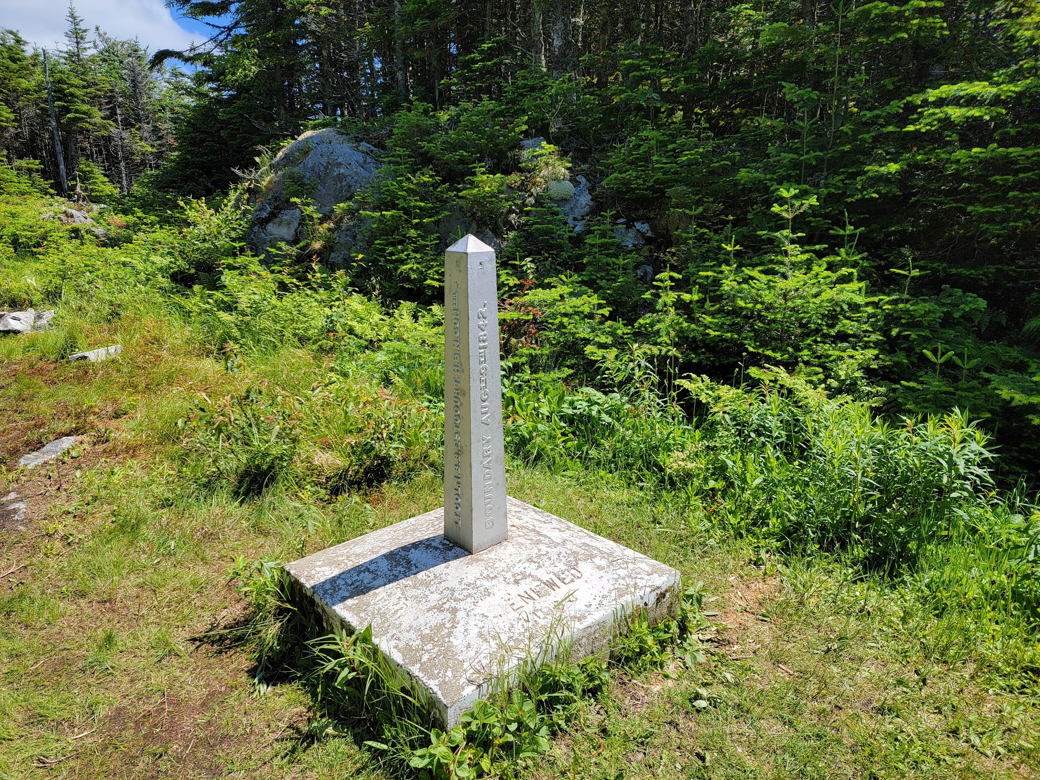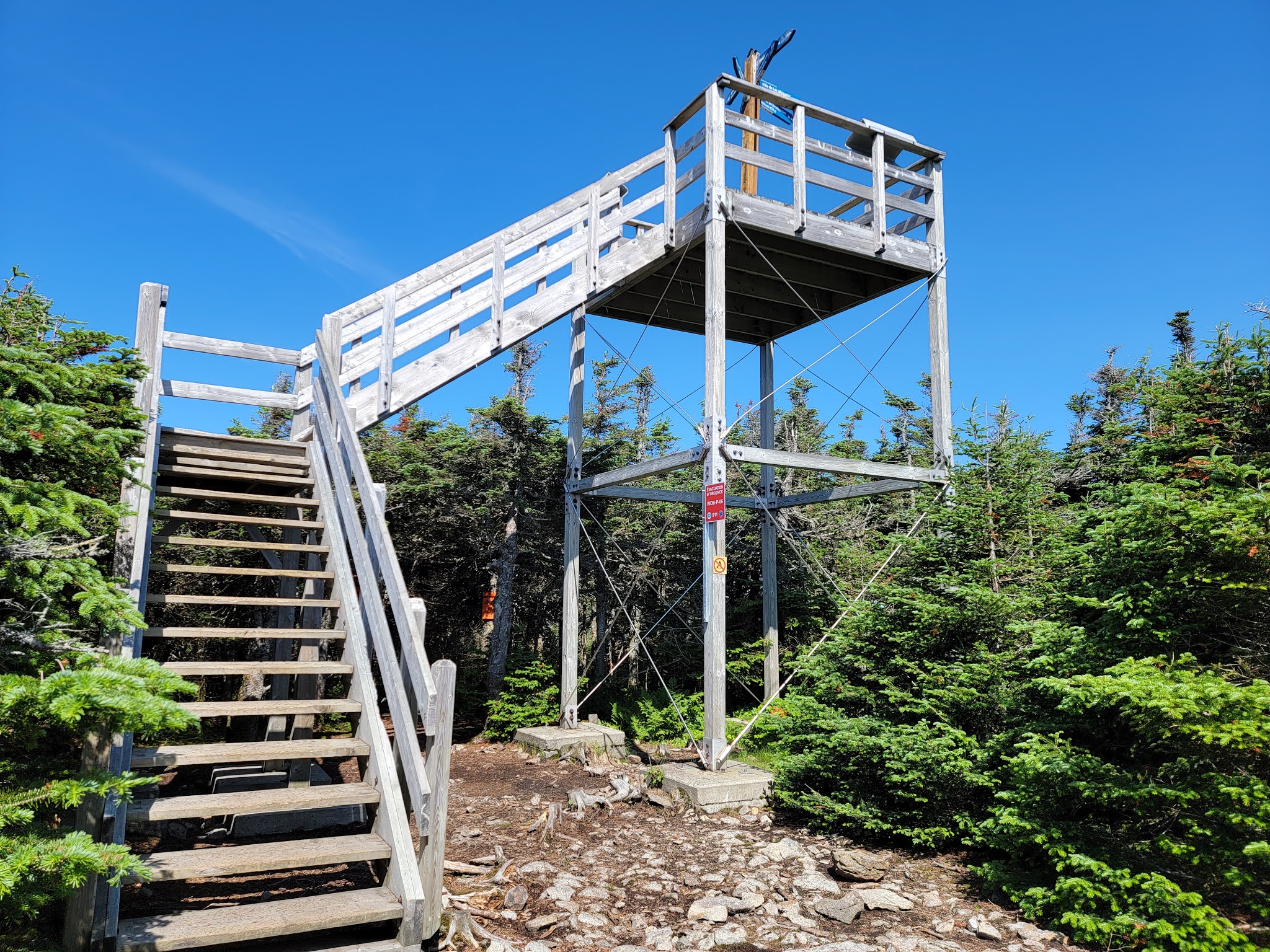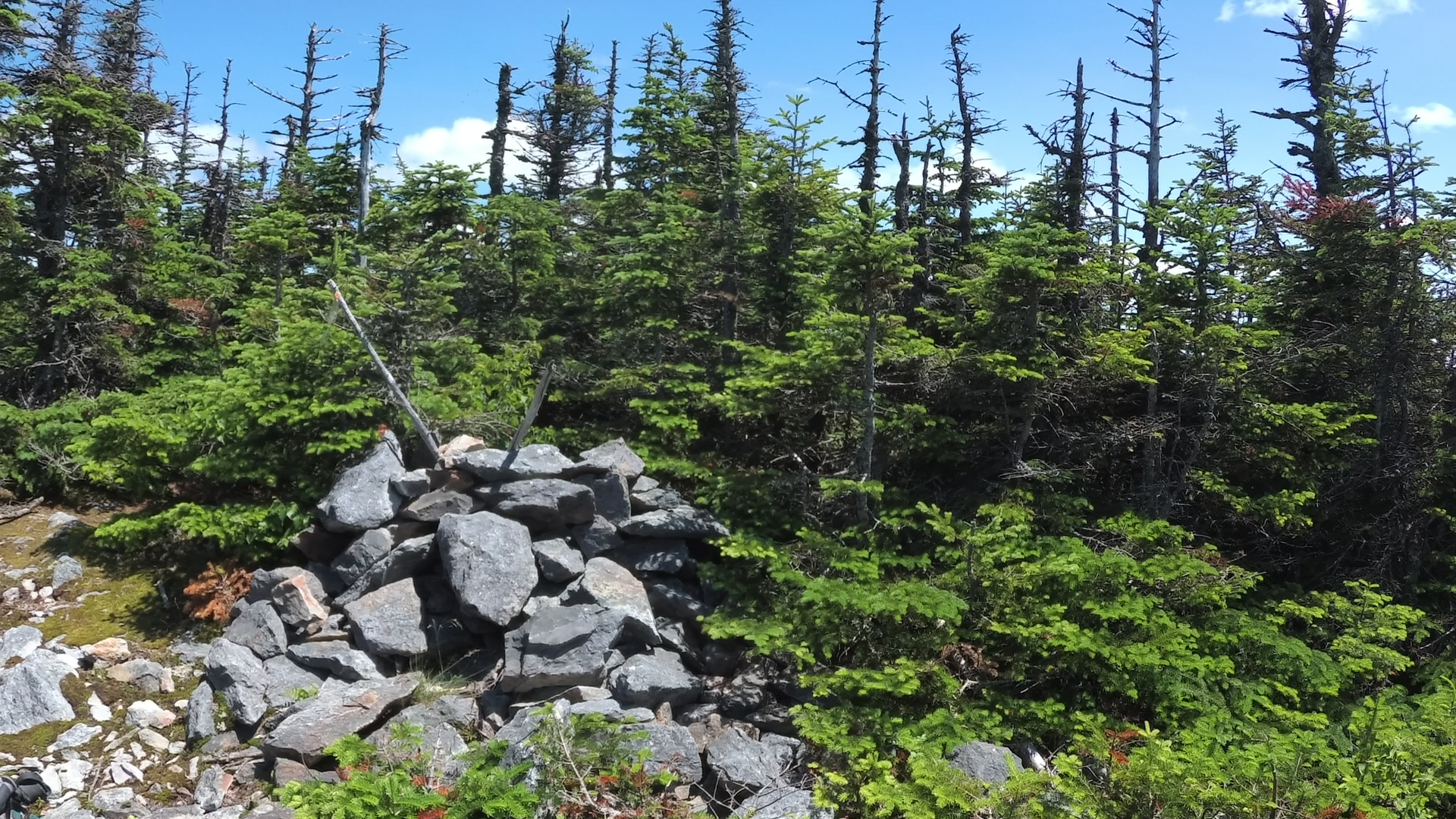 Le panneau indiquant le sommet est du coté américain, il faut légèrement entrer en forêt derrière le monticule de roches. On y verra la balise ‘Bounday 3855’, juste sous un panneau en bois indiquant ‘Panther 3855’. La vue est également surprenante de ce coté.