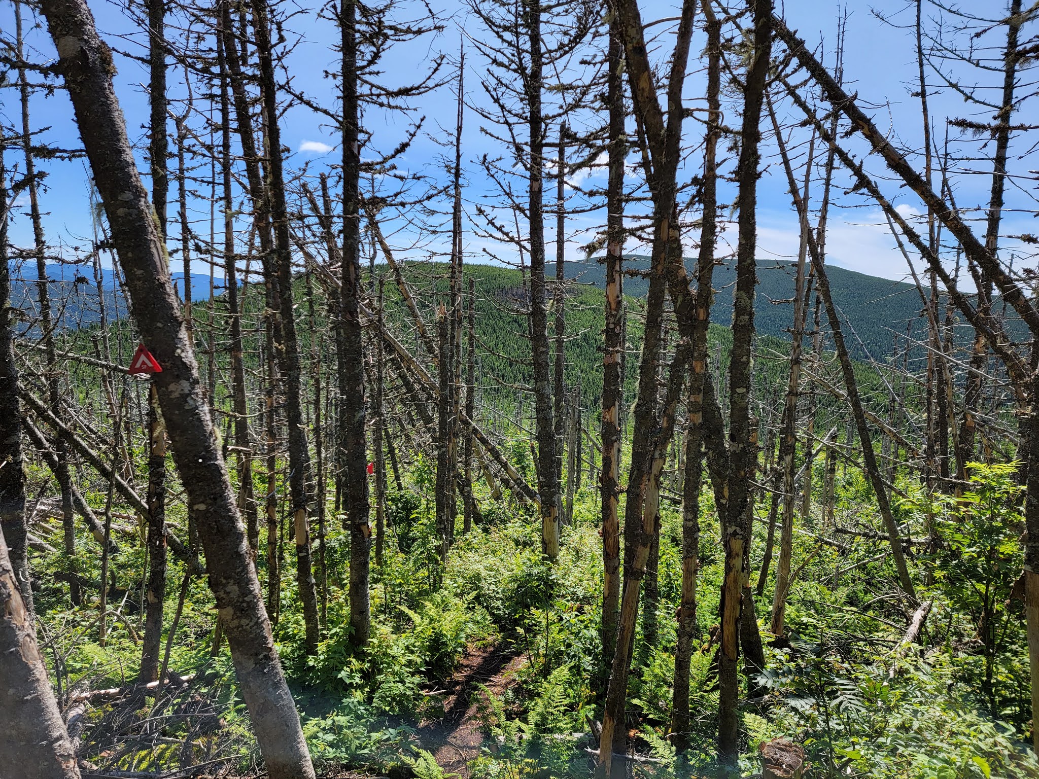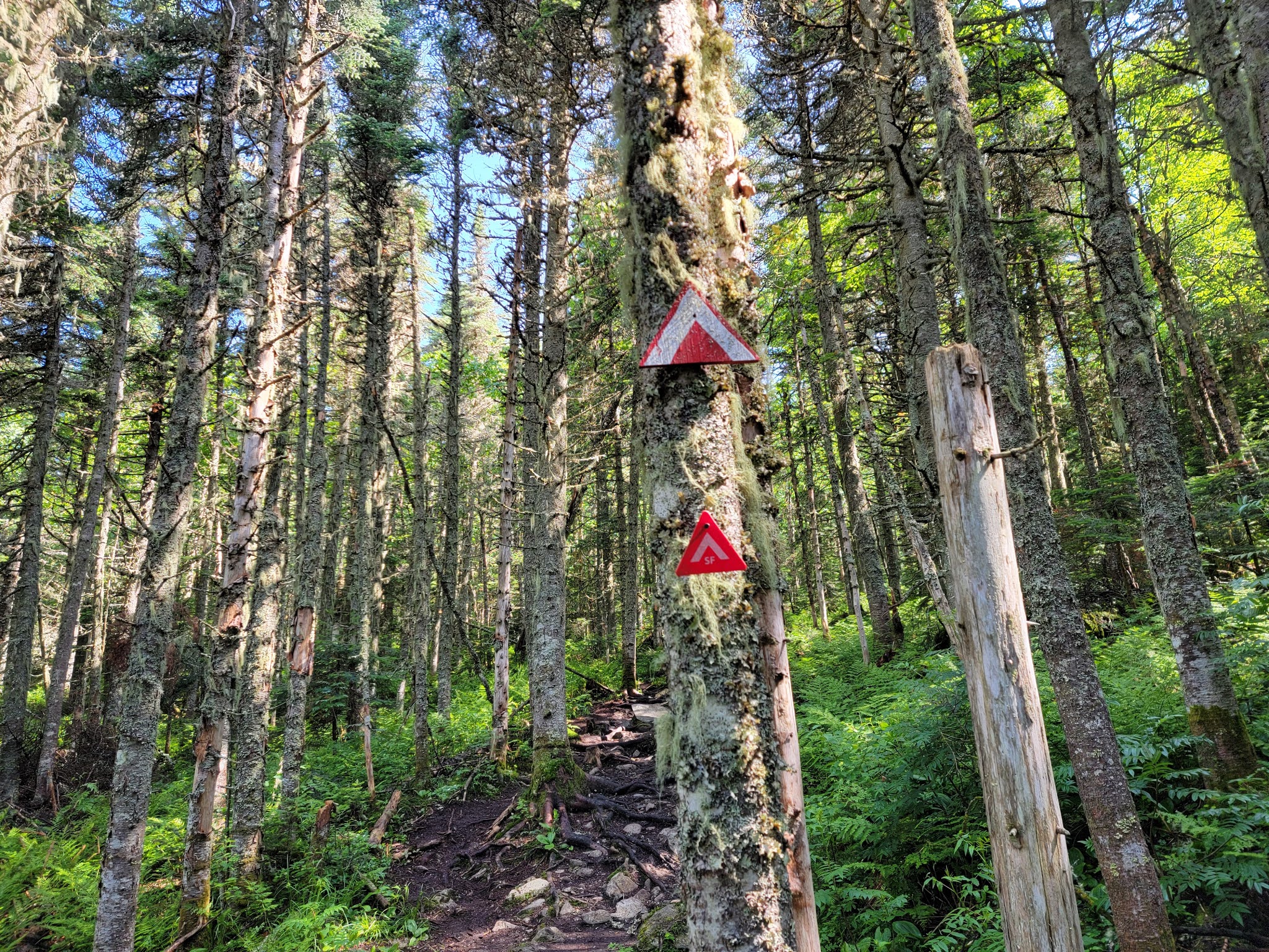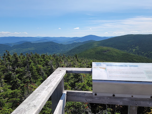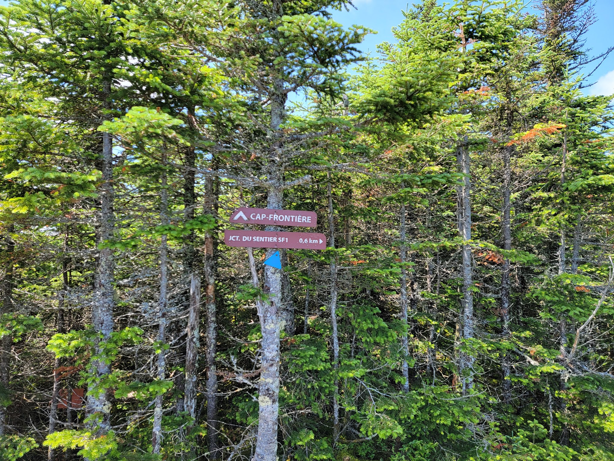 Le panneau indiquant le sommet est du coté américain, il faut légèrement entrer en forêt derrière le monticule de roches. On y verra la balise ‘Bounday 3855’, juste sous un panneau en bois indiquant ‘Panther 3855’. La vue est également surprenante de ce coté.