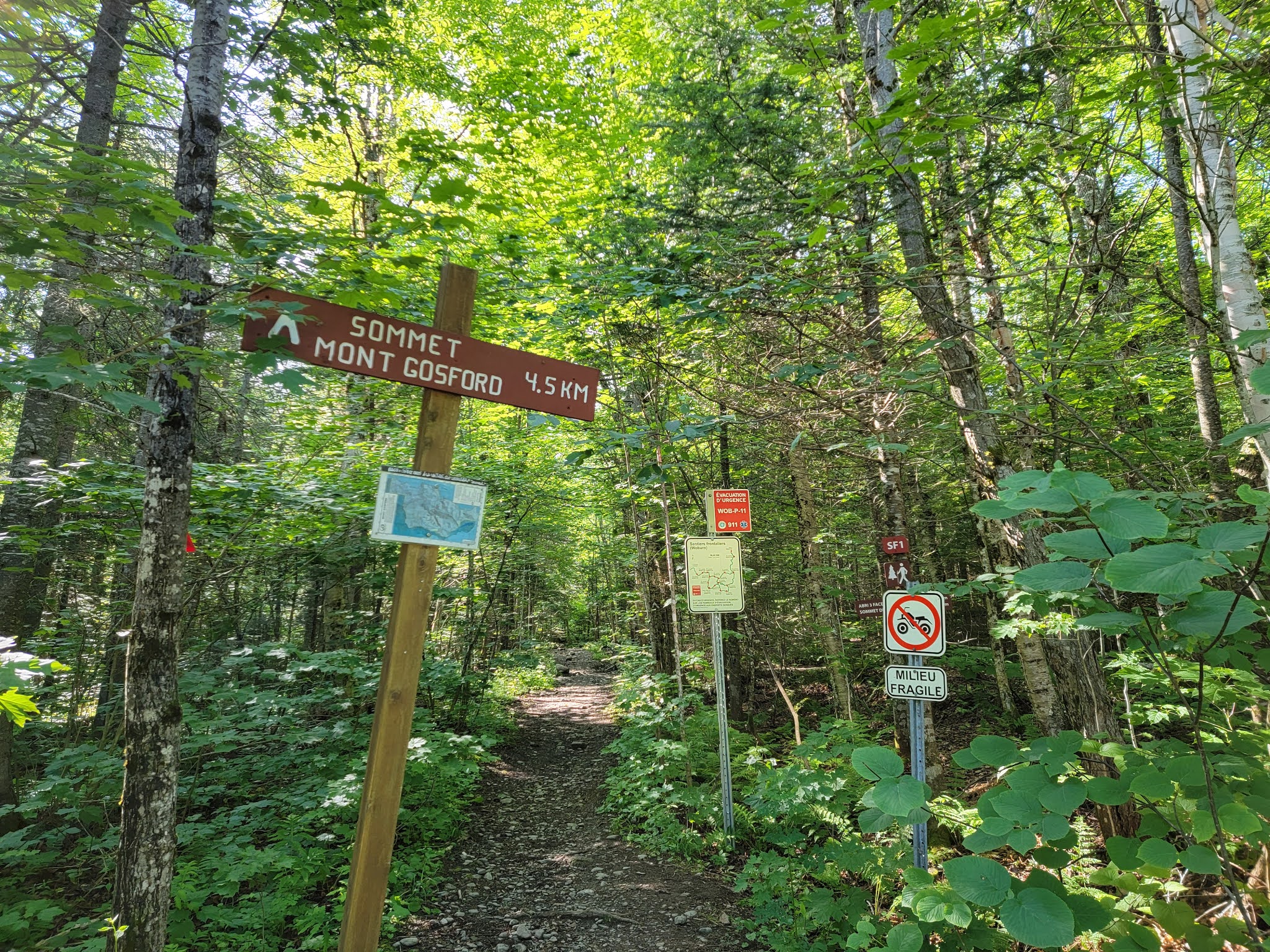 Le sentier SF1 (balise en triangle rouge et blanc) vous mène au sommet du mont Gosford en seulement 4.5 km du point de départ. Le dénivelé d’un peu plus de 500 m est bien réparti sur l’ensemble de la montée.
