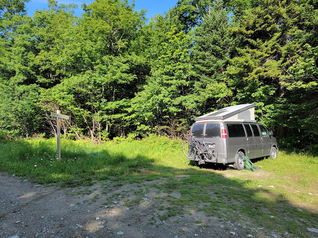Le 4e et dernier sommet de plus de 1 000 m est également sur la frontière. Je ne l’avais jamais fait avant aujourd’hui mais il en vaut la peine. Il faut continuer jusqu’à l’intersection à prendre pour le SF-7, situé à 1.5 km plus loin. De là, au lieu de prendre l’intersection à droite, on poursuit pour un aller/retour de 3.5 km au total. Rapidement, on aperçoit le sommet au loin sur la frontière, motivant pour s’y rendre, non! 🙂