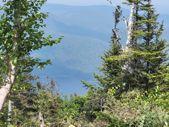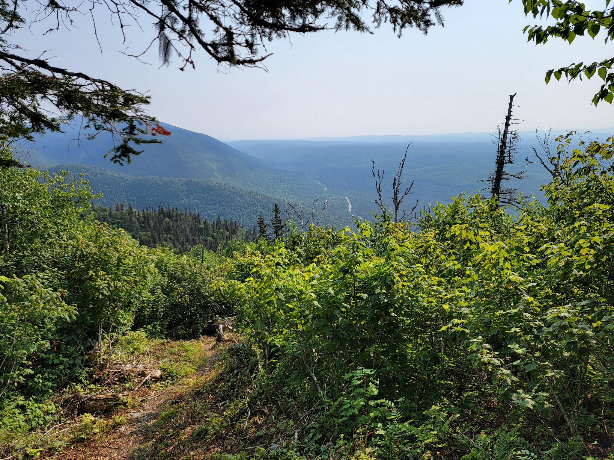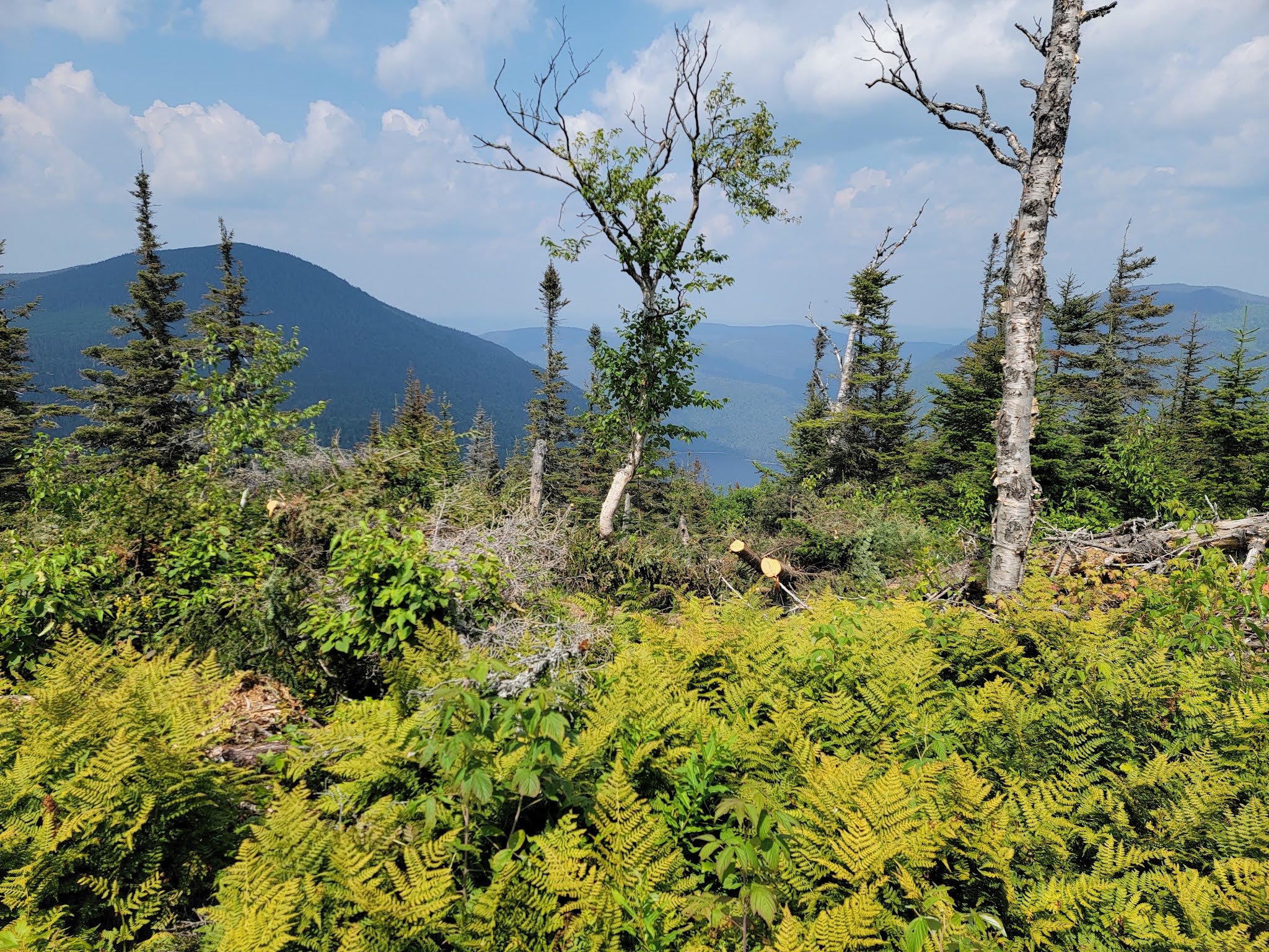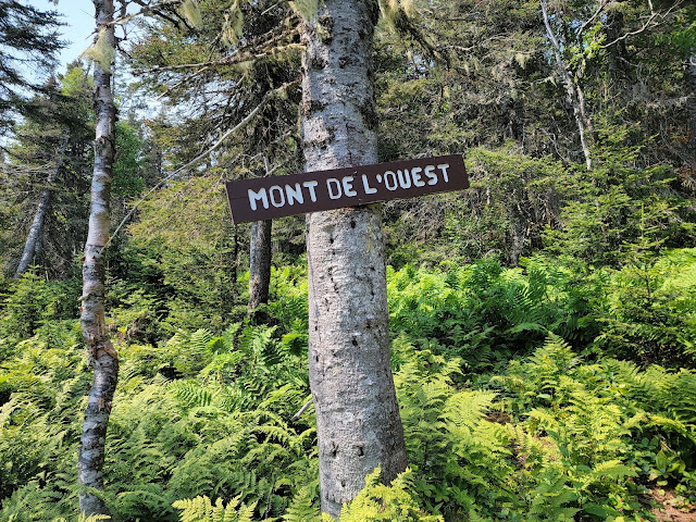 Le sentier débute par une solide montée de près de 1.5km… soyez prêt à monter…. et à redescendre au retour! Une fois en haut, vous êtes sur le sommet du Nid de l’Aigle, mais il n’y a pas vraiment de vue dans ce secteur boisé,mise à part quelques aperçus sur le lac Matane. Puis ce sont quelques montées et descentes sur les montagnes avec une jolie végétation (en août) et la traversée de quelques ruisseaux. La dernière montée pour rejoindre le mont de l’Ouest est également un bon défi. Une fois au sommet, c’est la surprise…. aucune vue, le sommet est complètement boisé.