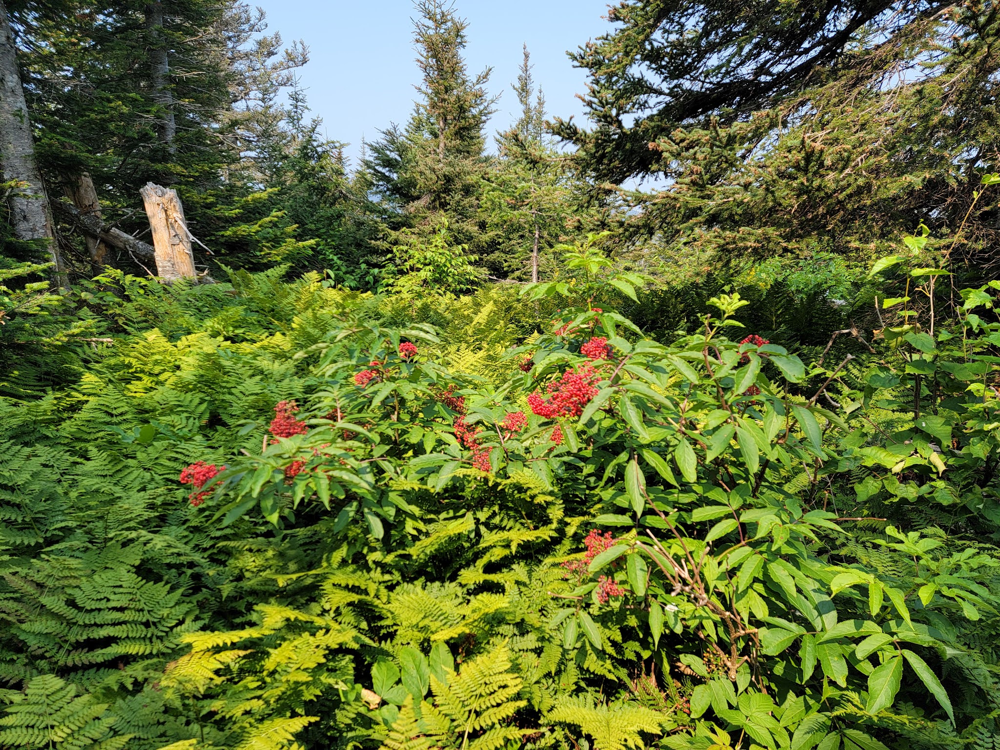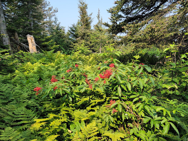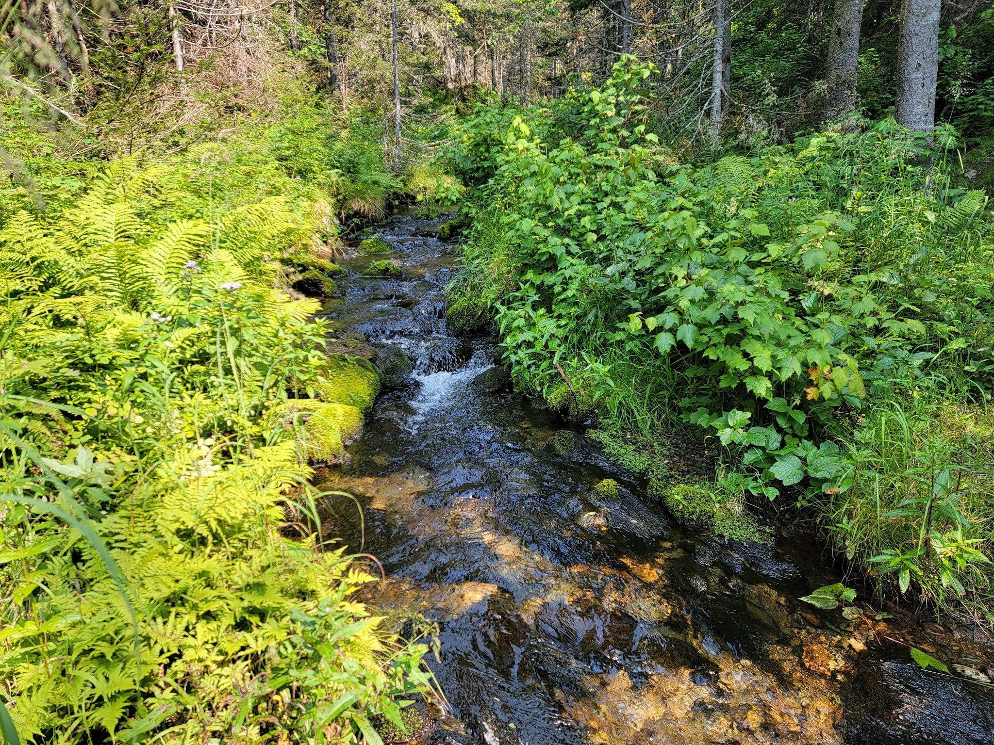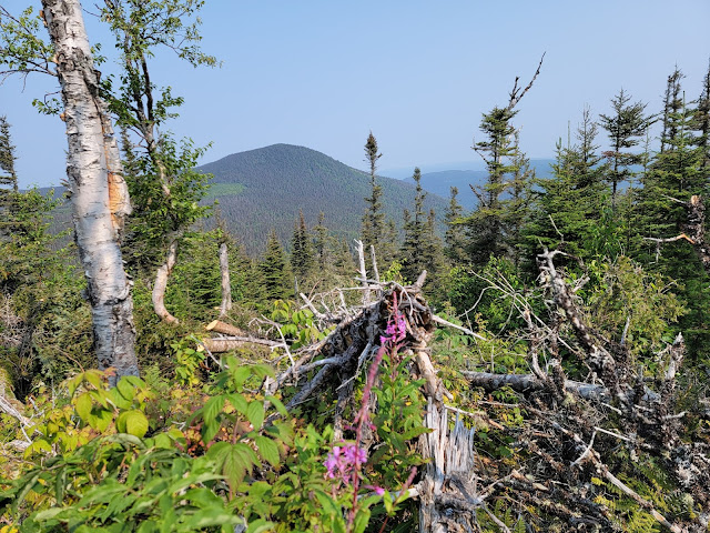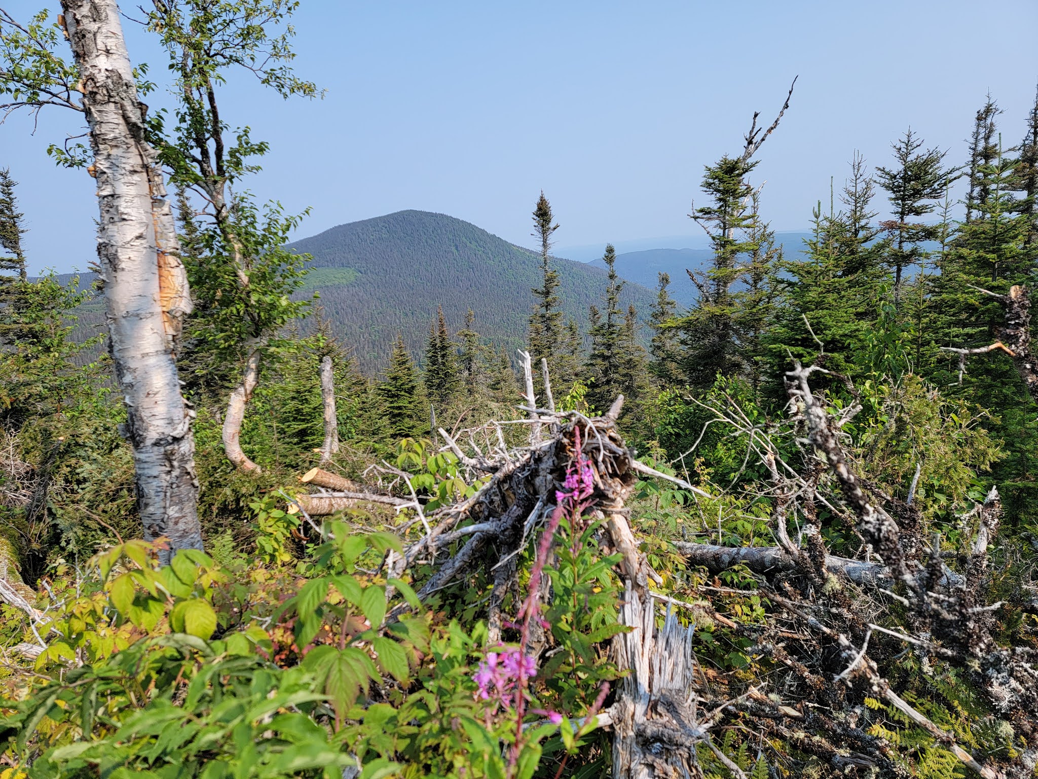 Le sentier débute par une solide montée de près de 1.5km… soyez prêt à monter…. et à redescendre au retour! Une fois en haut, vous êtes sur le sommet du Nid de l’Aigle, mais il n’y a pas vraiment de vue dans ce secteur boisé,mise à part quelques aperçus sur le lac Matane. Puis ce sont quelques montées et descentes sur les montagnes avec une jolie végétation (en août) et la traversée de quelques ruisseaux. La dernière montée pour rejoindre le mont de l’Ouest est également un bon défi. Une fois au sommet, c’est la surprise…. aucune vue, le sommet est complètement boisé.