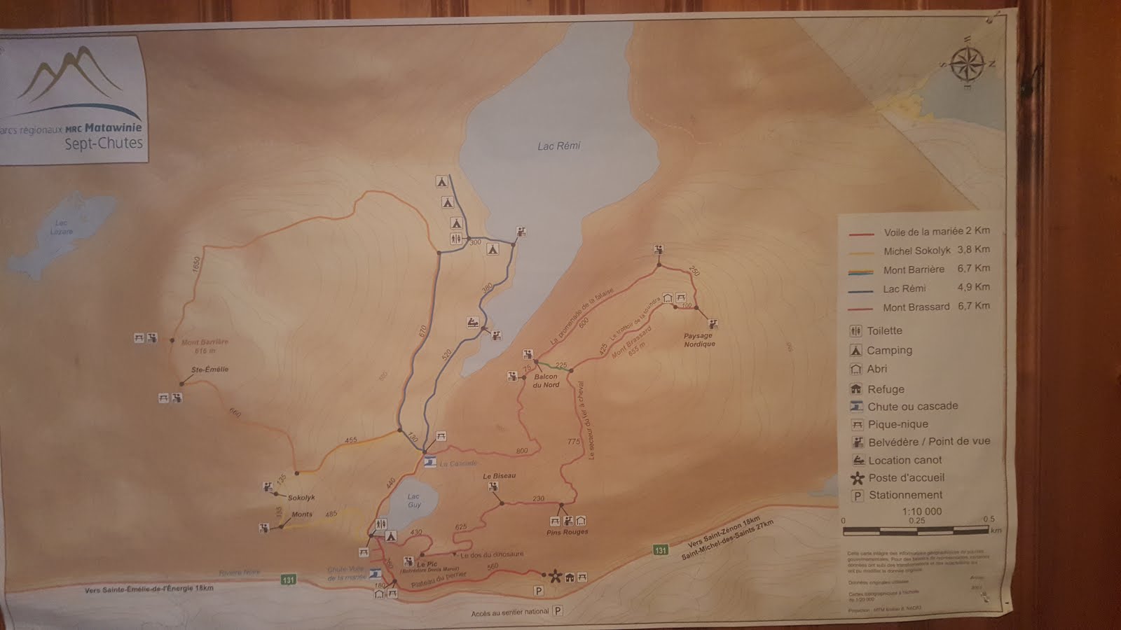 Pour les détails, voir les infos concernant le Sentier «Voile de la Mariée», le sentier du Lac Rémi et le sentier du Mont Barrière. Lorsque vous complétez la boucle du mont Barrière, il suffit de prendre droite le sentier qui longera le lac Guy puis rejoindre le sentier «Voile de la Mariée» pour revenir à votre point de départ.