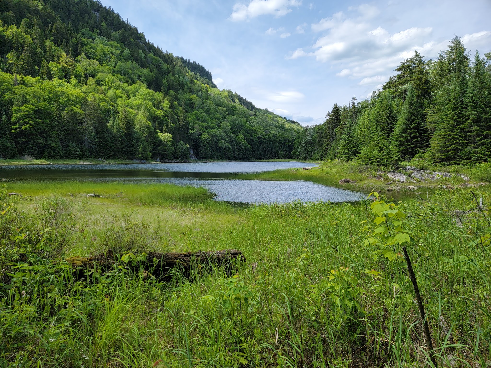 Vous atteindrez une intersection au bord du joli lac Inconnu. Ici, je vous propose de prendre à gauche pour un court détour de 500m (1 km aller/retour) afin de vous positionner sur les caps rocheux que vous apercevez au haut de la falaise du lac Inconnu.